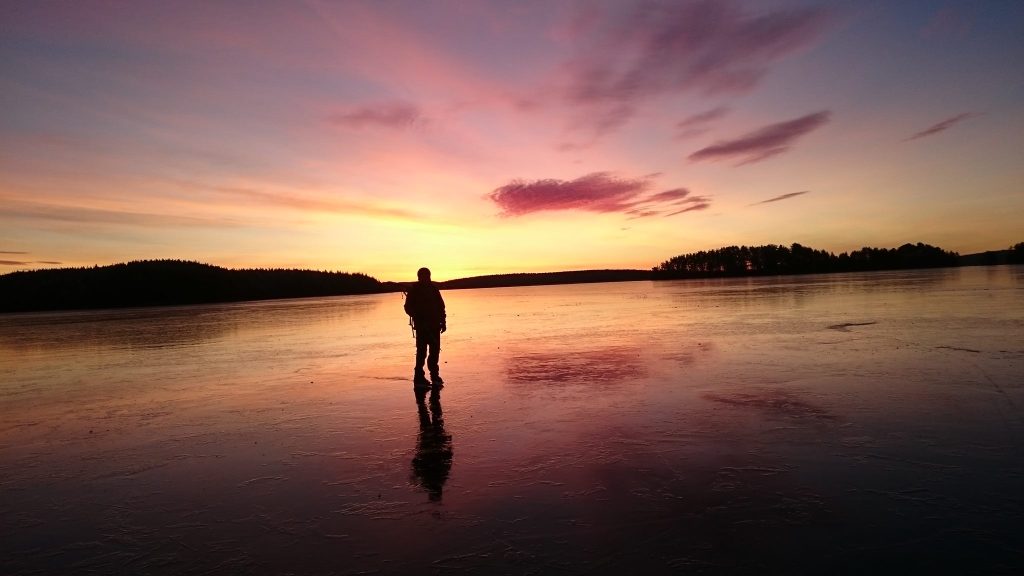 Nästa bild är tagen av Niklas (vännen, basen, kanotbyggaren, skrinnaren med mycket mera) en magisk januari-natt 2015. Vi var några som gav oss iväg ut i beckmörkret. Den där hisnande känslan av att åka ut i, på, något odefinierbart svart var en fantastisk upplevelse. Sällan har beskrivningen ”skräckblandad förtjusning” passat bättre.