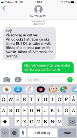 Ett sms är egentligen inte stort bättre än en kaka. Möjligen beror det på innehållet, förstås. Till nedan stående sms eller tidigare nämnda kaka medföljde inte någon innehållsdeklaration. Men jag kan inte låta bli att fundera: varför vill människor inte diskutera IRL, nuförtiden? Det är bara sossarna som i någon större utsträckning satsar på samtalskampanjer och det verkar inte betala sig i väljarstöd.