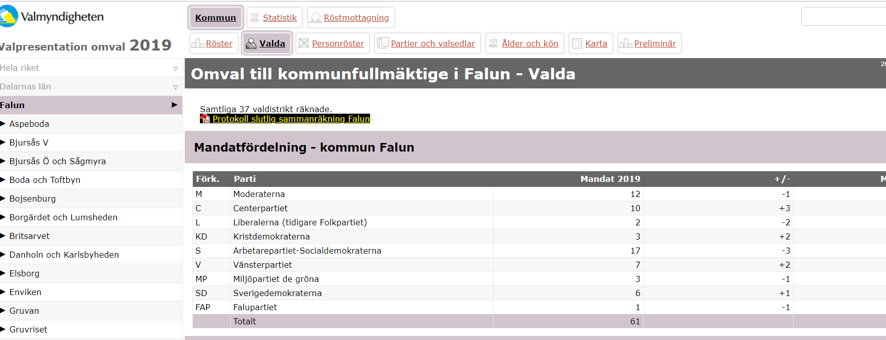 En rolig kommentar var att det inte har varit så tätt med rikskändisar i stan sedan drottning Kristina var här. Valdeltagandet låg på knappt 60% jämfört med knappt 90% första gången. Det får nog anses som tillräckligt bra och alla partier verkligen ansträngt sig. Hur gick det, då? Jo, så här:
