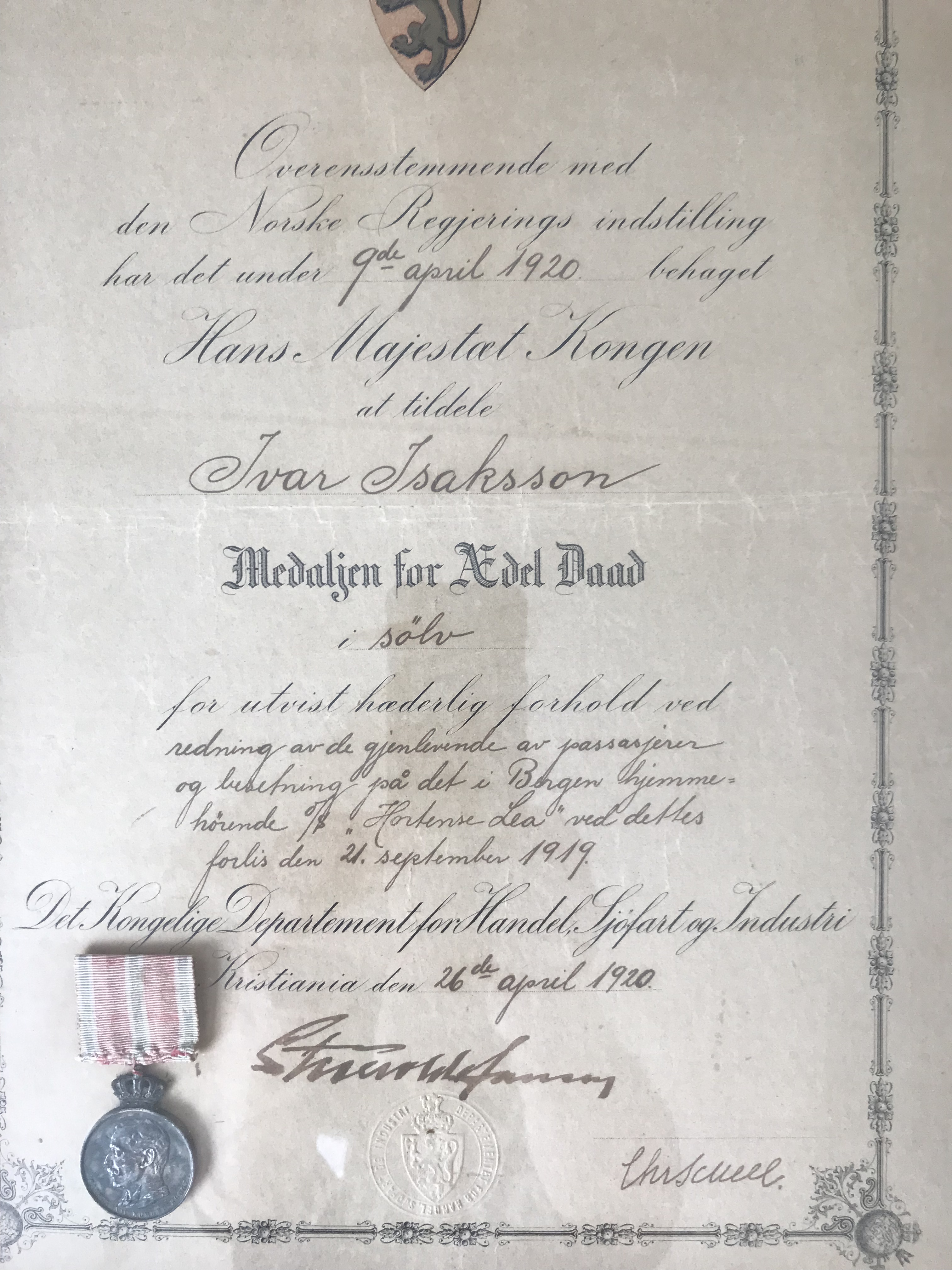 Överensstemmende med den norske regerings instilling har det under 9:e april 1920 behaget hans majestaet kongen at tildele Ivar Isaksson medaljen for Aedel Daad i Sölv for utvisat haederlig forhold ved redning av de gjenblevende av passasjerer og beselning på det i Bergen hjemmehörende ss ”Hprtense Lea” ved dettes forlis den 21 september 1919.