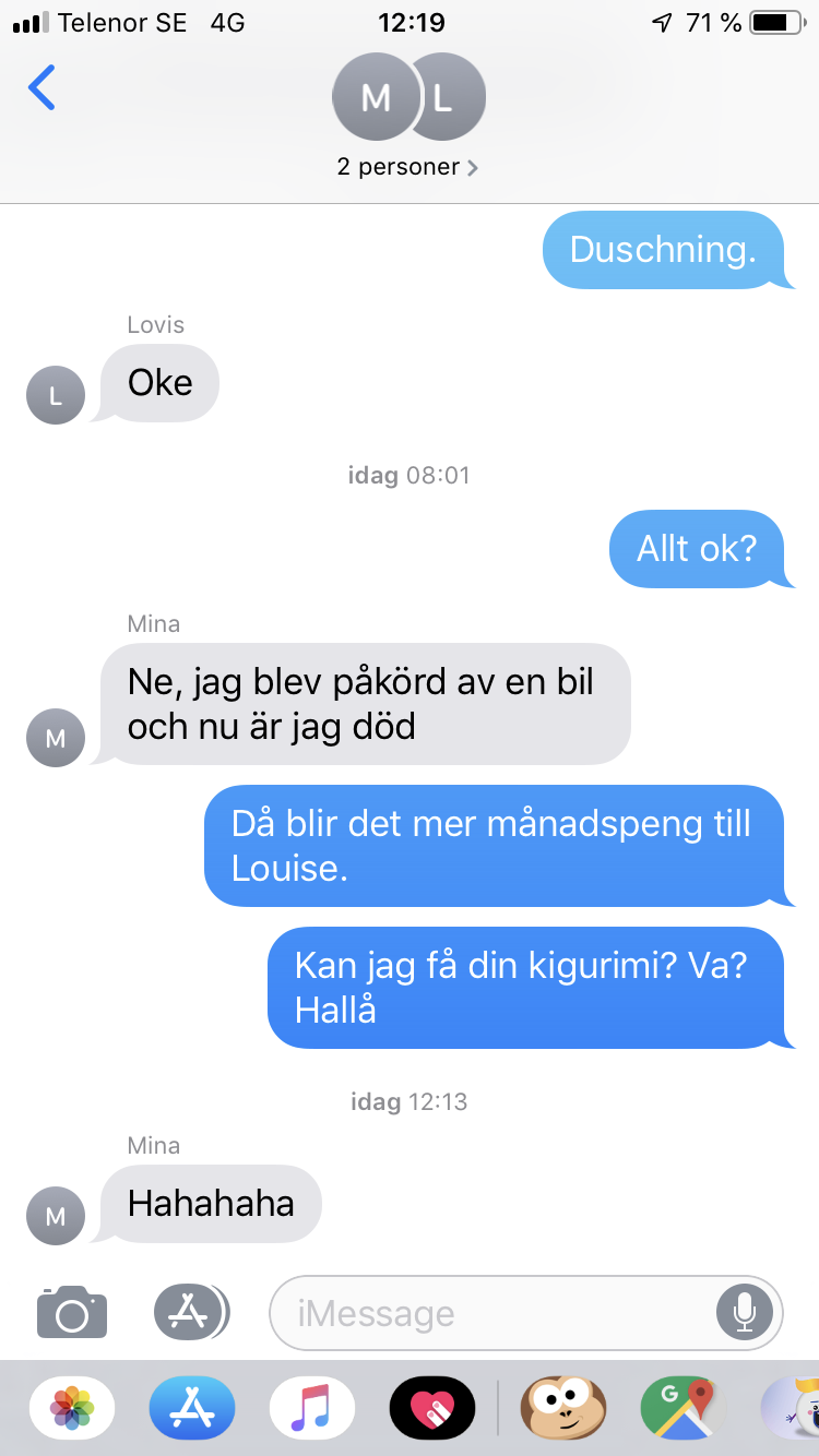 Det är nog det som är grejen – man får aldrig sluta brista ut i gapskratt. Gapskrattet hjälper mot det mesta. Länge leve gapskrattets gyllene konst. Härmed ordineras ett sådant. Ett gapskratt om dagen håller doktorn borta från magen.
