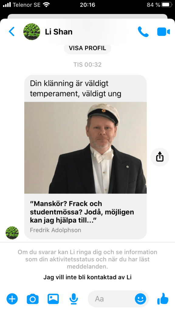 Li kanske verkligen gillar mig. Omöjligt är det iallafall inte. Li kanske verkligen tror att jag på bild 71 bär en ung (= nyinköpt?), temperamentsfull klänning och det har väckt hens intresse. Plattformen misstänker å sin sida argan list och antar att jag inte vill bli kontaktad av Li och erbjuder därför det alternativet.