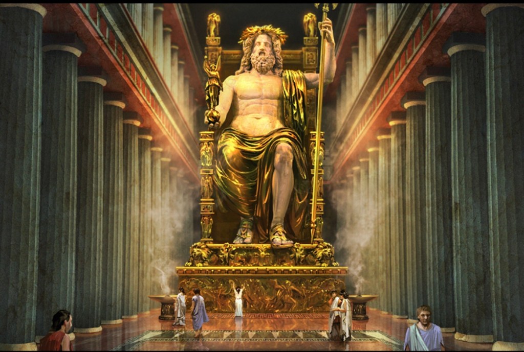 Zeusstatyn i Olympia. Alltings början. Ett av den klassiska världens sju underverk och helig mark i många hundra år. Vi vet inte mycket om underverket utöver att det var tolv meter högt, placerat i ett tempel i Olympia (på västra Peloponnesos), att det var alla grekers gemensamma fest/kultplats, att romarna flyttade det till Konstantinopel där det förstördes år 463 och att det givit avtryck in i vår tid.