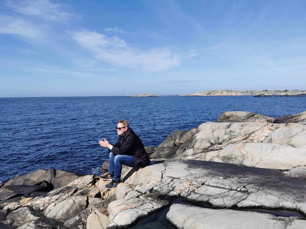 Under en annan stund några veckor senare befinner jag mig tillsammans med evigheten på Saltskärsudde på Styrsö. En något oländig plats där himlen möter havet. Väl där lämnar man den ogärna. Här möter jag ofta de som gått före. Jag tänker på far, sörjer honom. Han fattas mig nu när också han gått in i den vaggande ångan.