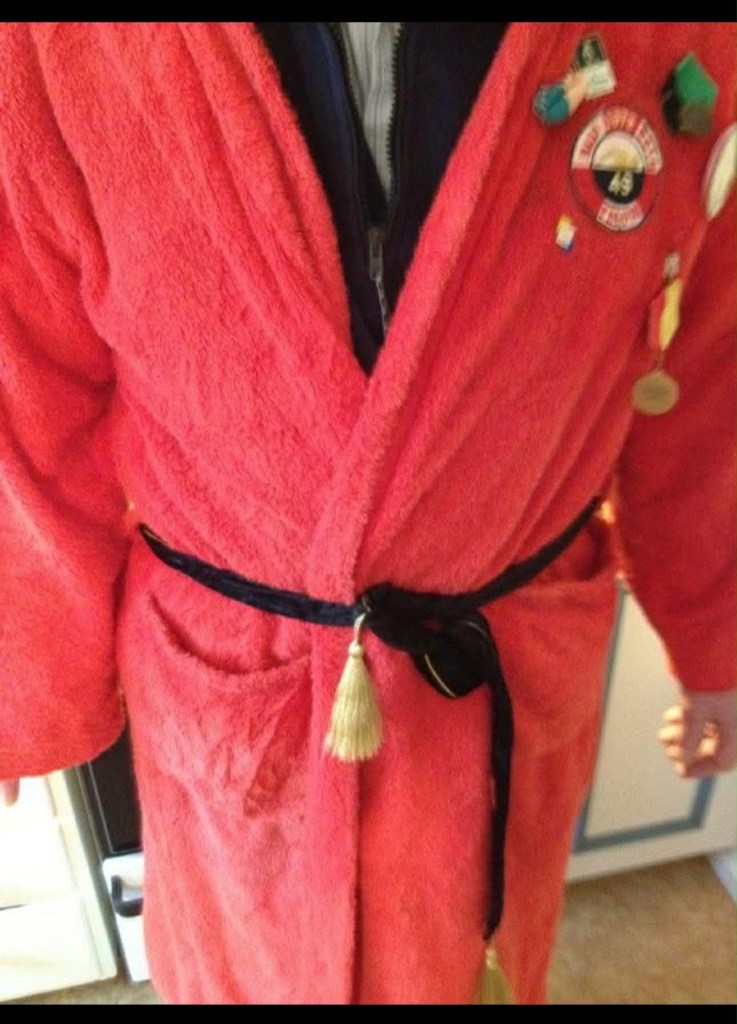 Jag vet inte hur många badrockar han slitit ut genom åren. Ett plagg så mycket mer än bara en badrock. Notera ”Svarta bältet” på bilden nedan, veterantecknet som förärats den med tusen besök i klubben. Tusen tidiga lördagsmorgnar, alltså. Pappa begravdes i sin badrock. Självfallet var den hans svepning in i evigheten.