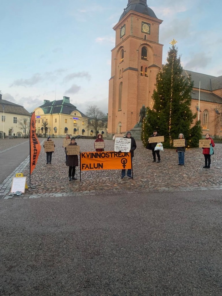 Nutid. Färgen är orange. På torget står några och demonstrerar varje fredag klockan femton. Ibland är jag med, men långt ifrån alltid. Ett tyst rop på hjälp, ett krav på att män ska sluta slå. En kvart varje fredag borde man väl ha till övers? På uppsidan finns att man får möjlighet att stanna upp och meditera över tillvaron den där kvarten. Kanske vända blicken inåt – om man vågar. De kvarvarande höstlöven är spröda och går lätt sönder. Allt blir under femton minuter påtagligt och verkligt. Våld är overkligt. Blicken söker efter mannen utanför gallerian men han är aldrig där.