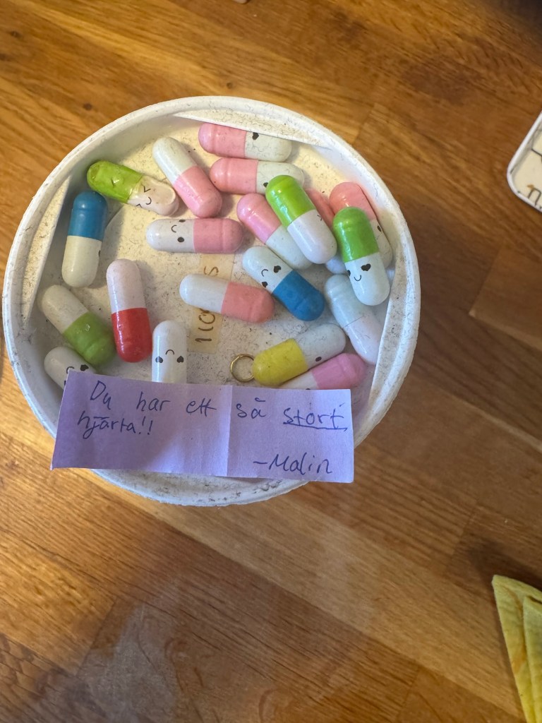 Midvinternattens metaforiska köld kan vara hård. Jag har därför en burk med små kapslar i. Jag fick den på fars dag en gång för länge sedan. Varje kapsel innehåller ett fint budskap från barnen och deras mor. Jag öppnar dem väldigt sällan, en i sänder. Men ibland behövs det. Påfallande ofta i december.