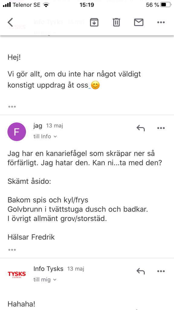 Han som var arg på mig stirrade. Så började han plötsligt skratta. ”Ja, du kan iallafall uttrycka dig, det får man ge dig! Vi skiter i det där – kom nu, Adolphson.” Kanske inte det bästa sättet att möta en utskällning. Men ändå.