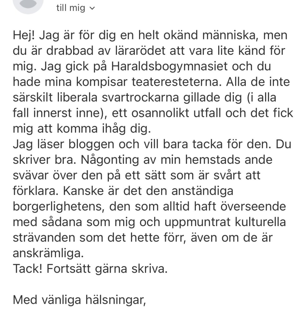 Jag svarade med att tacka för vänliga ord och att jag nästan alltid haft förmånen att komma väl överens med mina elever (trots märkliga provfrågor) och att jag tror och hoppas att framgångsreceptet är att faktiskt gilla det man gör samt vara intresserad av människor. I synnerhet den människa man har framför sig. All utbildning måste vara utformad på det sätt att den känns relevant för den som utsätts för den. Kort sagt: eleven har aldrig fel. Och bloggen (formatet är hopplöst otidsenligt, jag vet) har varit med mig sedan 2009. Den är en sorts offentlig terapi där jag hoppas att jag inte alltför ofta balanserar fel på gränsen mellan personlig och privat.