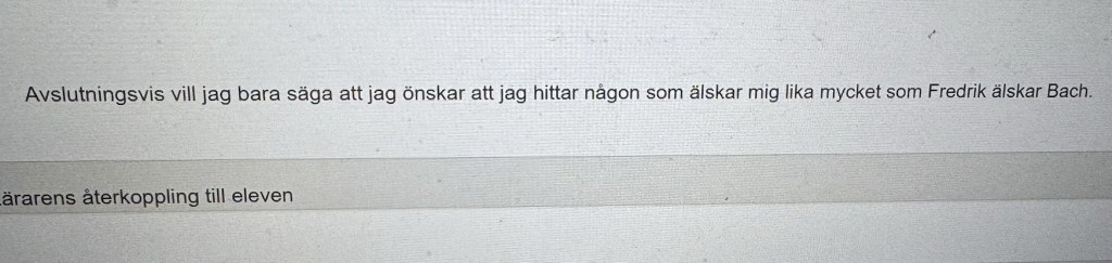 Sedan Bach. När tillvarons grinvindar blåser snålt, när tillvaron piskar andan ur en och världen rämnar, då finns han alltid där, Johann Sebastian, redo med en stor, varm och kärleksfull kram. Själv tyckte jag att uppgiften koppla ihop Mammon med Mammografi utifrån de politiska partiernas syn på vinster i välfärden var en bra provfråga. Det tyckte inte några elever (ryckerpåaxlarna-emoji). Efter några toner av Bach rinner emellertid misslyckandets bitterhet sakta av.